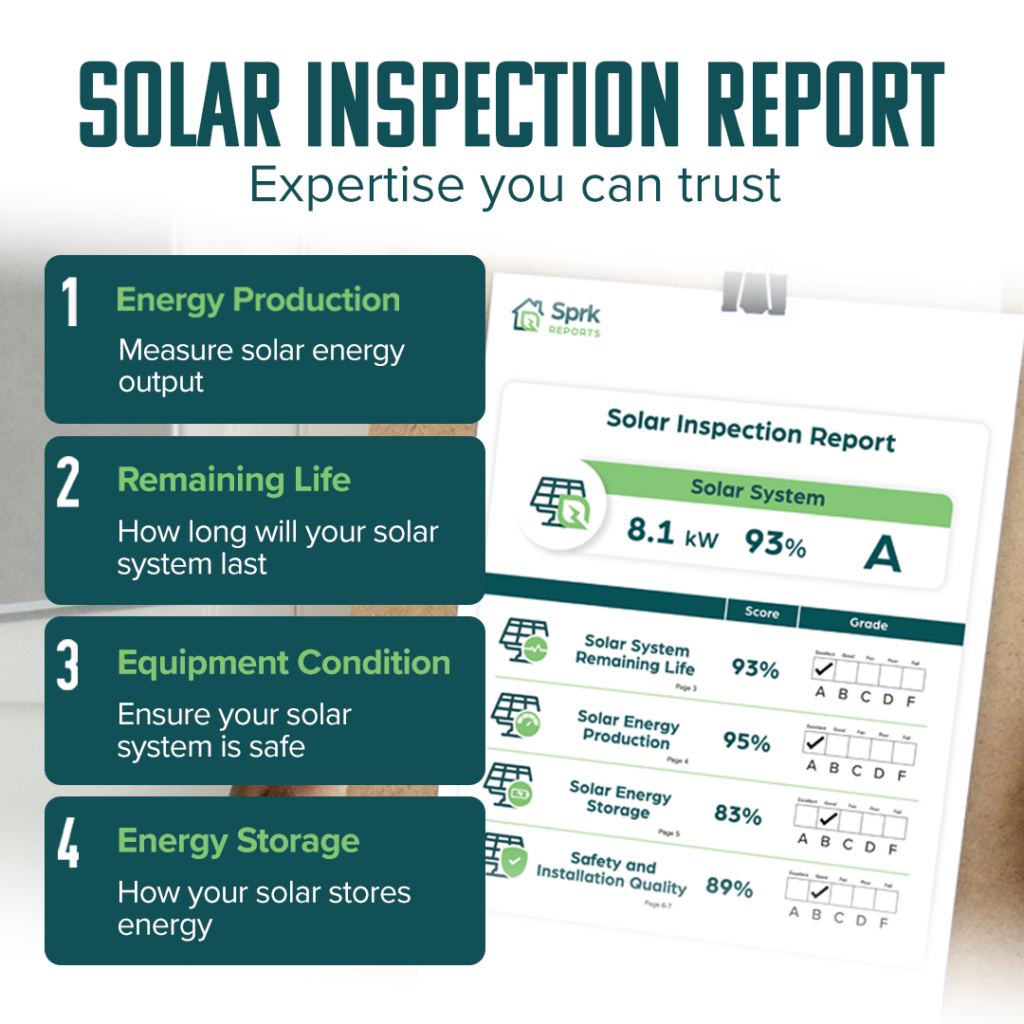 The solar report is clear, with scores for major categories: estimated solar system remaining life, production output, storage, and installation quality. Potential issues are identified before they become expensive failures.